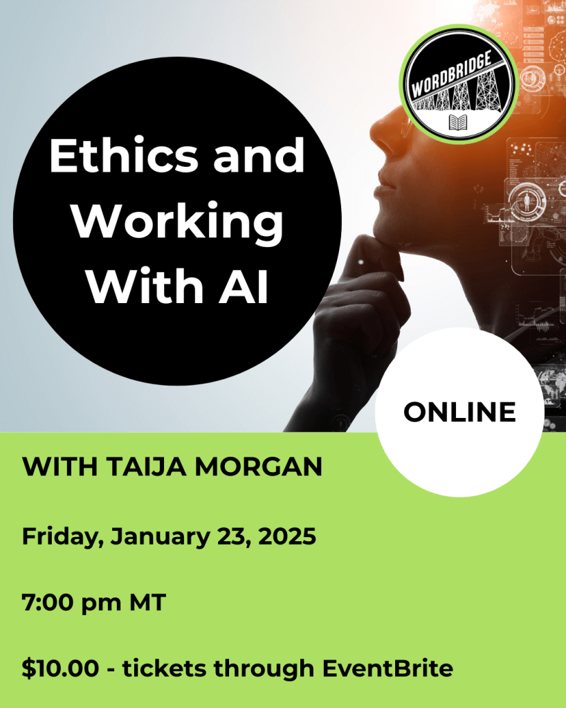 Friday, January 23rd, 2026 | 7 – 8 PM MST: ETHICS IN THE WILD WEST: WORKING WITH AI AS A WRITER OR EDITOR with Author and Editor Taija Morgan